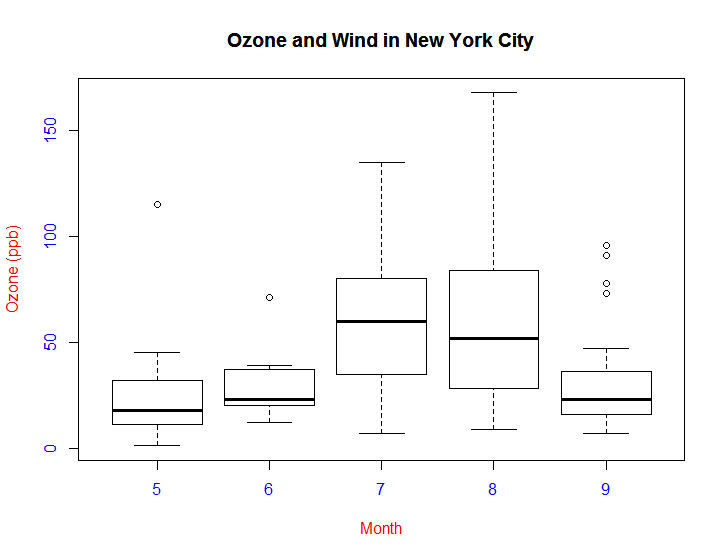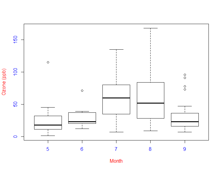 boxplot(Ozone ~ Month, airquality, xlab="Month", ylab ="Ozone (ppb)", col.axis = "blue", col.lab = "red") # x축명, y축명, 축색깔, 레이블색을 지정한다.