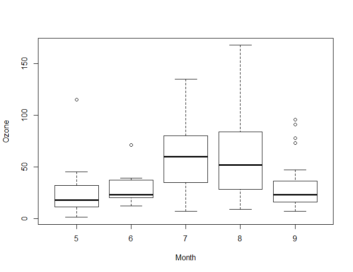 boxplot(Ozone ~ Month, airquality) #airquality 데이터의 Ozone에 대한 Month값을 보여준다. 타이틀을 자동 생성하지 않는다.