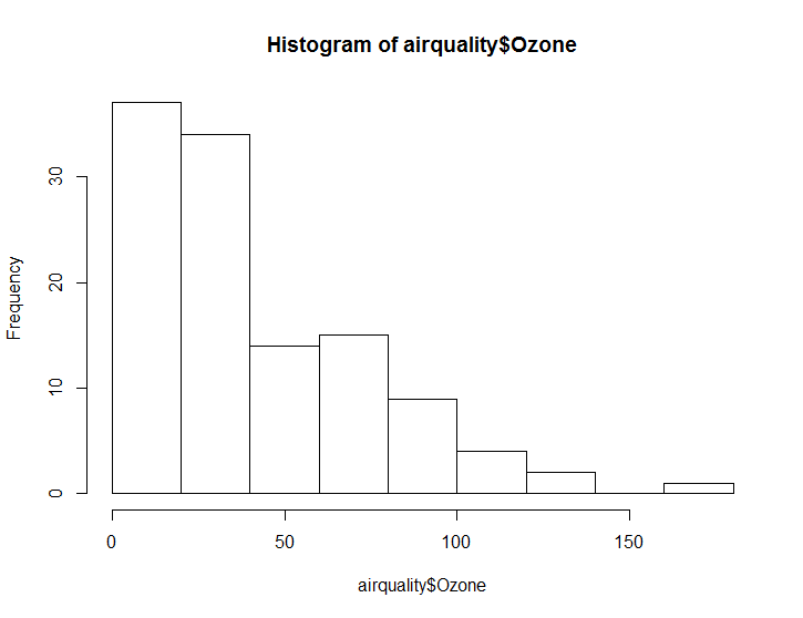 hist(airquality$Ozone) # Ozone의 분포를 보여준다. 제목 및 축값들은 R에서 자동으로 초기 생성한다.