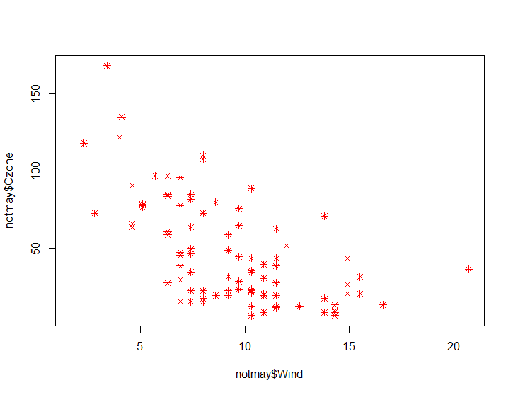 plot(notmay$Wind, notmay$Ozone, col="red", pch=8) # 빨간색 눈송이 형태로, wind 및 ozone을 표시한다.