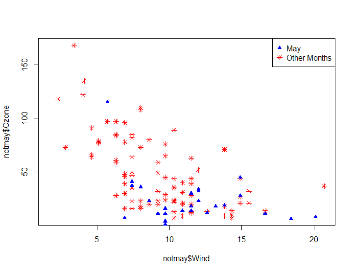 legend("topright", pch=c(17, 8), col=c("blue", "red"), legend=c("May","Other Months")) # 오른쪽 위에 범례를 추가한다.