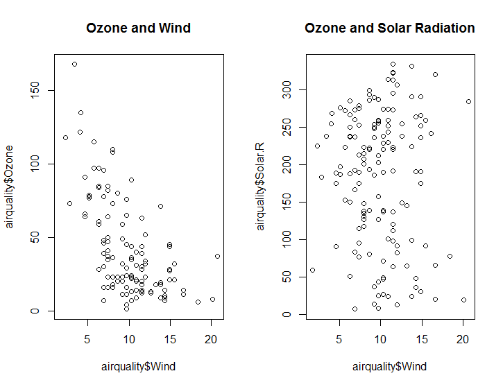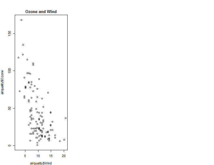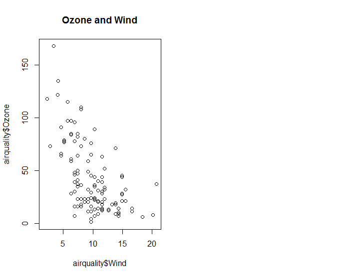 plot(airquality$Wind, airquality$Ozone, main = "Ozone and Wind") # 그래프 1개를 그린다.