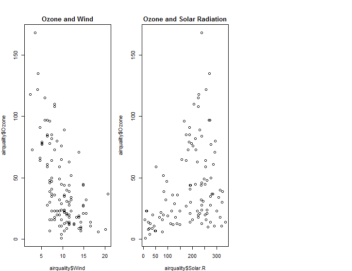 plot(airquality$Solar.R, airquality$Ozone, main="Ozone and Solar Radiation") #두번째 그래프를 그린다.