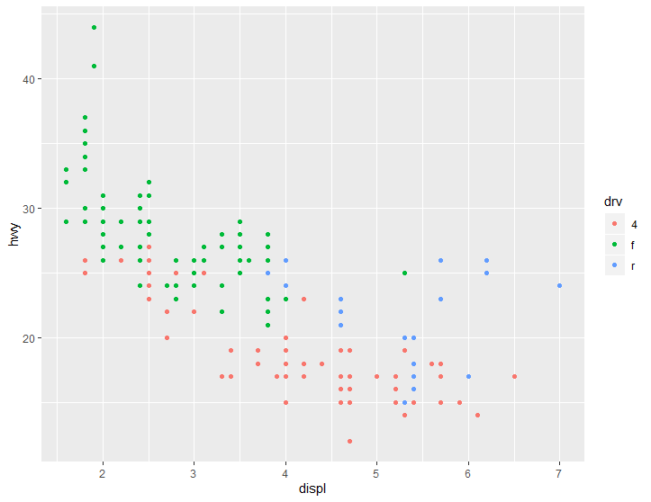 > qplot(displ, hwy, color=drv, data=mpg) #위의 예제에서 drv의 색상에 따른 그래프를 그려보자. drv는 전동휠, 후방휠, 4륜으로 구분된다.