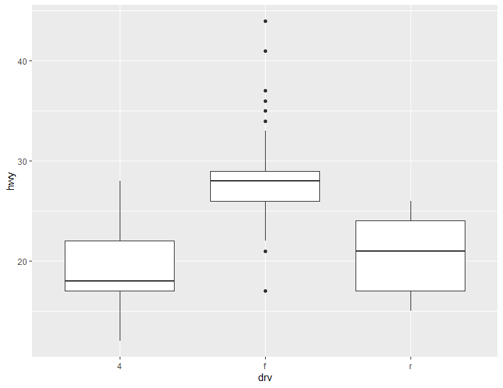 > qplot(drv, hwy, data=mpg, geom="boxplot") #qplot으로 boxplot도 그릴 수 있다. 그려보자. 드라이브 형태에 따른 3가지 박스플롯을 보여준다.