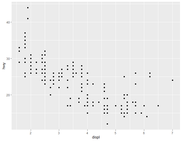 > qplot(displ, hwy, data=mpg) #ggplot2에 내제된 mpg란 데이터에서, 엔진 교체가 갤런당 마일에 대해 그래프를 그려보자.