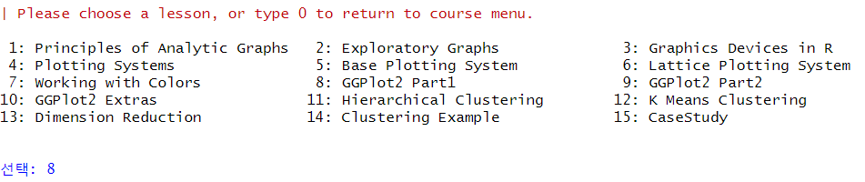 Exploratory Graphs 과정에서 8번 플로팅 시스템(8. GGPlot2 Part1)을 선택한다.