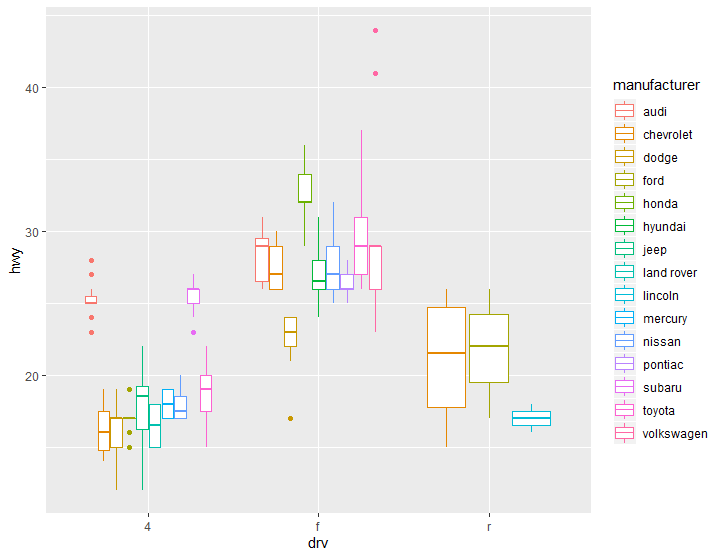 > qplot(drv, hwy, data=mpg, geom="boxplot", color=manufacturer) #여기서 색상을 제조사로 구분해보자. 좀 복잡해보여도, 3개의 플롯의 제조사별 세부 그래프를 보여준다.