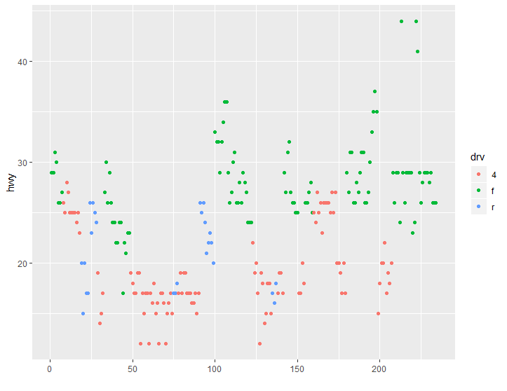 > qplot(y=hwy, data=mpg, color=drv) #hwy값을 y로 놓고, 그래프를 그리면 어떨까? 이러면, 전체 hwy 데이터의 순서대로 각 데이터 값을 출력한다.