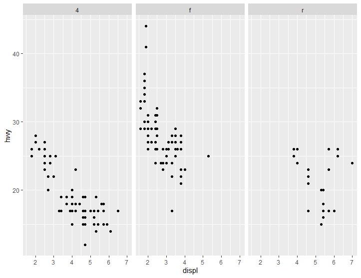 > qplot(displ, hwy, data=mpg, facets = .~drv) #이번에는 한 페널에 표현하지 말고, 3개의 페널로 구분해서 표현해보자. facets의란 변수를 통해 각 데이터를 drv 변수에 따라 구분해서 표현해보자.